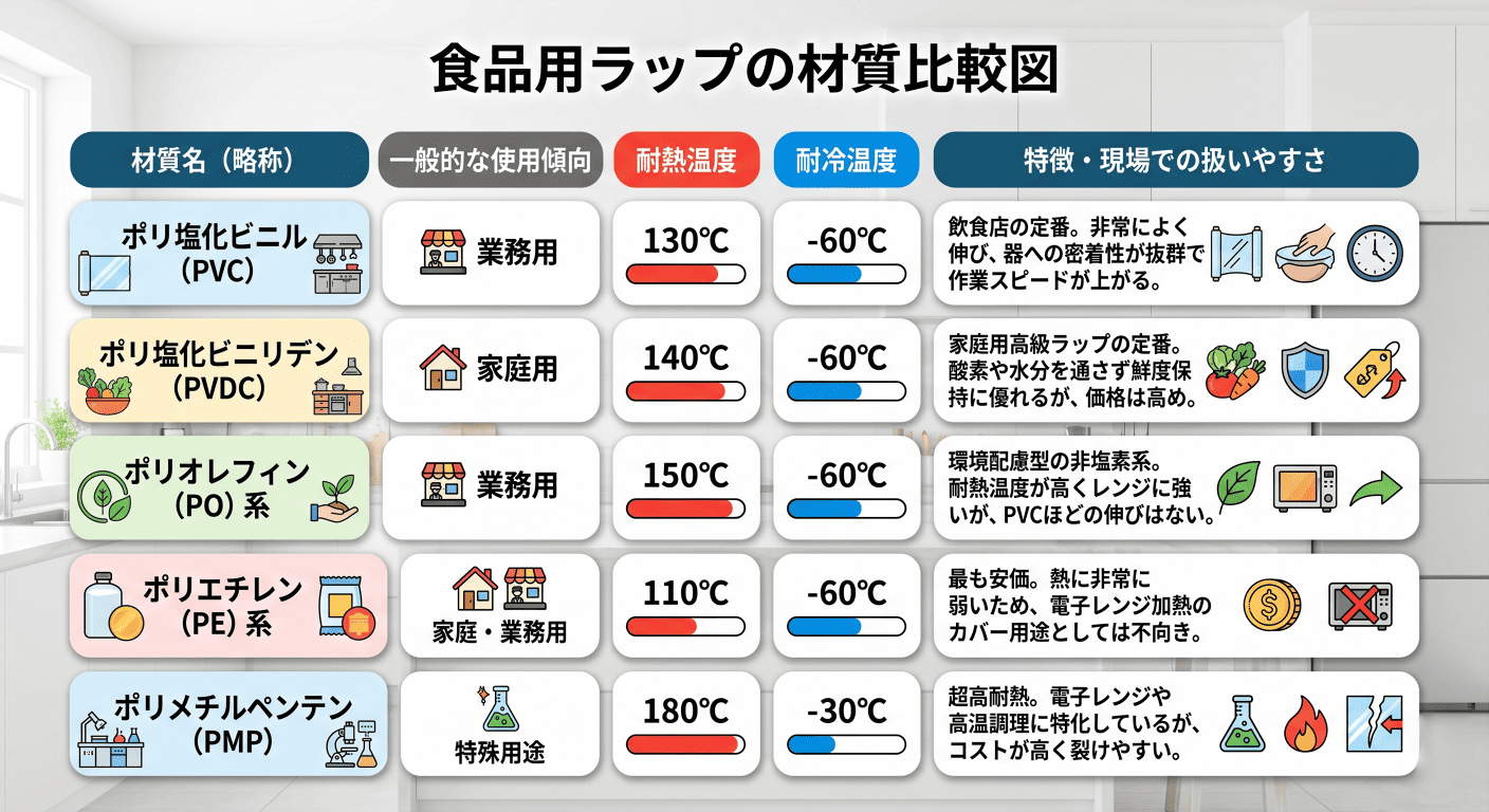 電子レンジでのトラブルを防ぐ第一歩は、現在店舗で使用しているラップの「材質」と「耐熱温度」をスタッフ全員が正確に把握することです。ラップには主に以下の5種類があり、それぞれ耐えられる温度が明確に異なります。